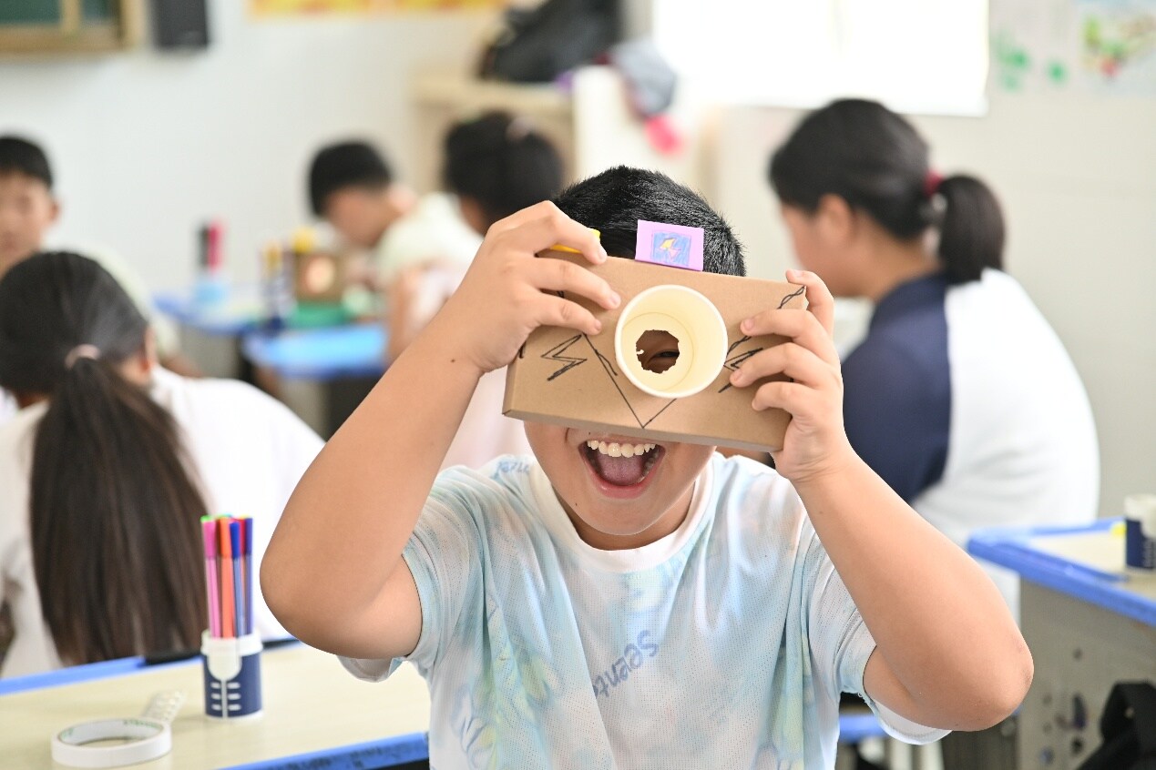 美工課上,陽光把紙箱、紙杯和瓶蓋堆成的小山鍍上金邊。呂語萱老師舉起相機(jī)按動快門,“咔嗒” 聲引著孩子們湊近觀察——有人數(shù)鏡頭螺紋,有人摸凸起的按鈕,還有人舉紙杯比對弧度。當(dāng)一件件 “紙箱相機(jī)” 舉過頭頂,歪扭的鏡頭、搖搖欲墜的按鈕都透著認(rèn)真。孩子們瞇眼 “拍照”,假裝按下瓶蓋快門時,教室里的光影仿佛都被這一份份童真定格,滿是純粹的歡喜。
