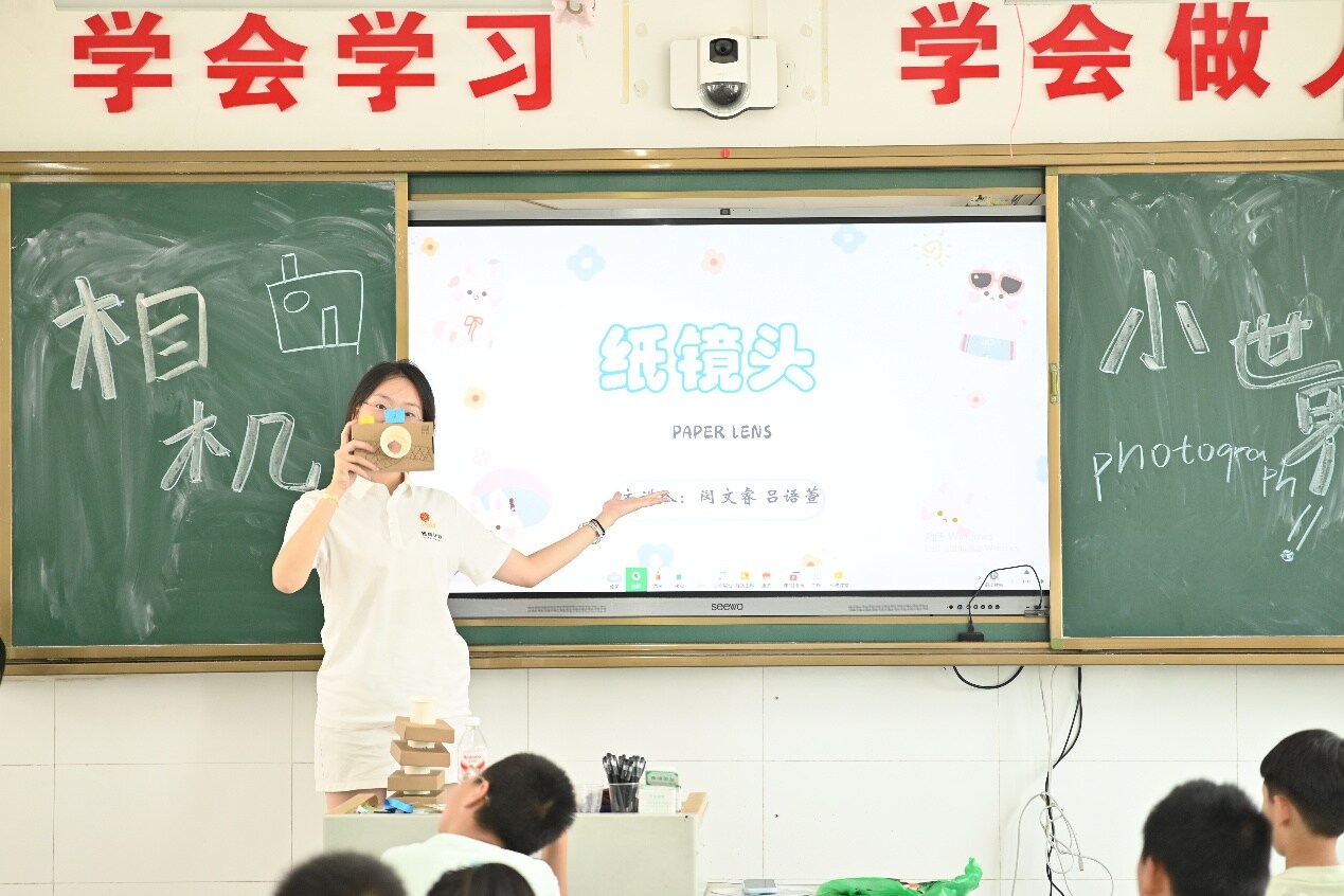 圖為老師正在向孩子們講解卡紙相機(jī)的組裝過程 陳立志 農(nóng)姚 攝