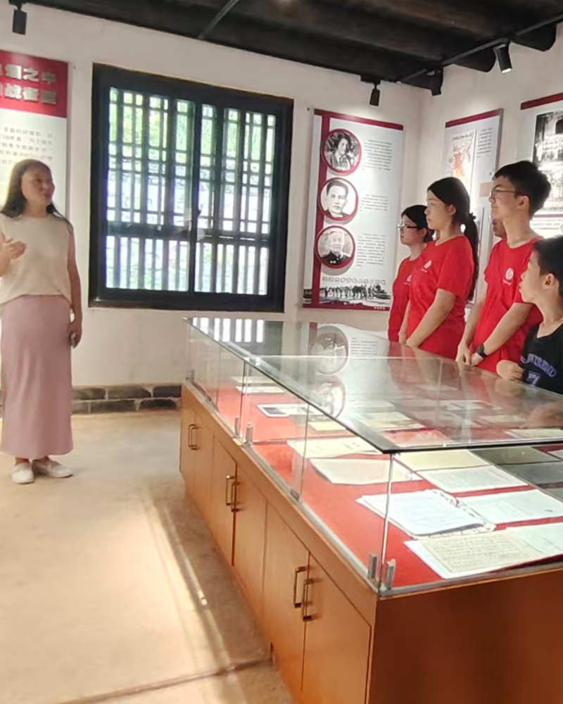 跟隨先輩們的足跡,16名身著統(tǒng)一紅色文化衫的中南大學支教老師懷著肅穆的心情參觀了陳列館。隊員們集體肅立凝望浮雕墻,當?shù)刂v解老師指著墻上的黑白照片,聲情并茂地講述著革命過往:“大家看這張1940年的合影,后排左三就是熊子烈同志,他當時剛從敵占區(qū)冒著槍林彈雨帶回一批藥品。為了把物資送進根據(jù)地,他偽裝成貨郎,挑著擔子翻了三座山,鞋底磨穿了就用茅草裹著腳走,硬是在封鎖線間撕開了一道口子。”莊重的氛圍中涌動著蓬勃的青春活力,勾勒出新時代青年傳承革命精神的鮮活實踐場景。