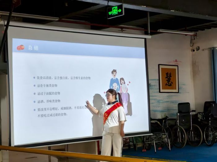 宣講核心聚焦老年特殊生理需求,系統解讀“科學膳食健康寶典”。志愿者用“身體如精密儀器需優質燃料”的比喻,說明味覺退化、代謝減緩對飲食的新要求。重點呈現“十大健康金律”:倡導每日5-6餐少量多餐;建議以豆制品部分替代紅肉優化蛋白;詳解采用蒸、煮、燉方式并限制油炸;指導輪換使用花生油、橄欖油等植物油;提醒素食老人重視從堅果、菌菇中補充蛋白質、B12等營養素。針對高血壓等慢病,深入剖析“少三白(鹽、糖、脂)”與“多三黑(黑木耳、黑米、黑豆)”飲食原則,將國家膳食指南“每日食鹽攝入量低于5克”建議與多攝入富鉀蔬果的益處結合,科學闡釋其在穩定血壓、延緩并發癥中的作用。