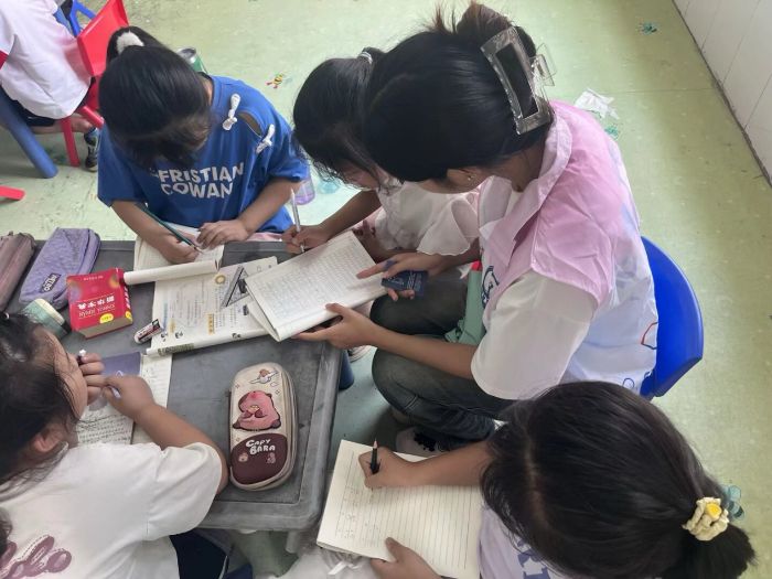 圖為實踐隊員為鄉(xiāng)村兒童進行課業(yè)輔導(dǎo)。通訊員 徐桐 攝
