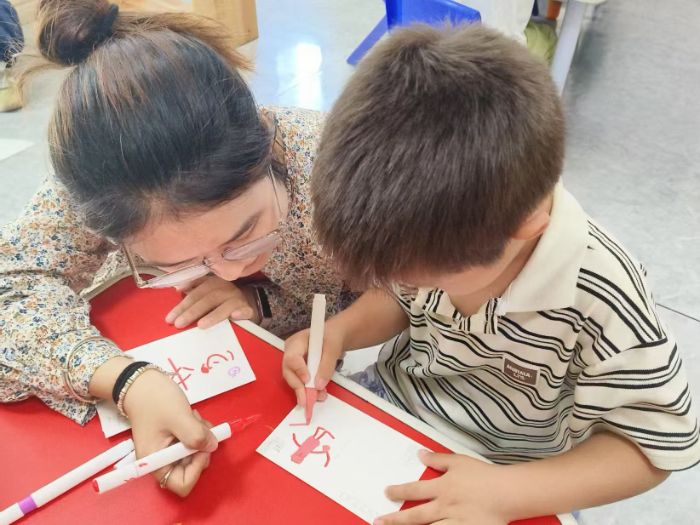 (圖為我志愿者為小朋友們講解如何制作紅色明信片,王嘉祺通訊員攝)