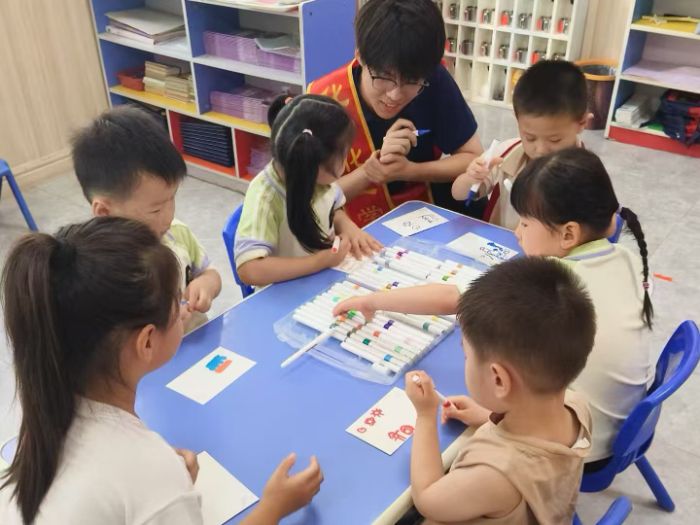 (圖為我志愿者指導(dǎo)小朋友進(jìn)行紅色明信片手工創(chuàng)作,王嘉祺通訊員攝)