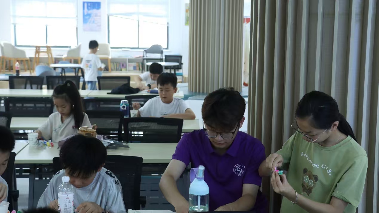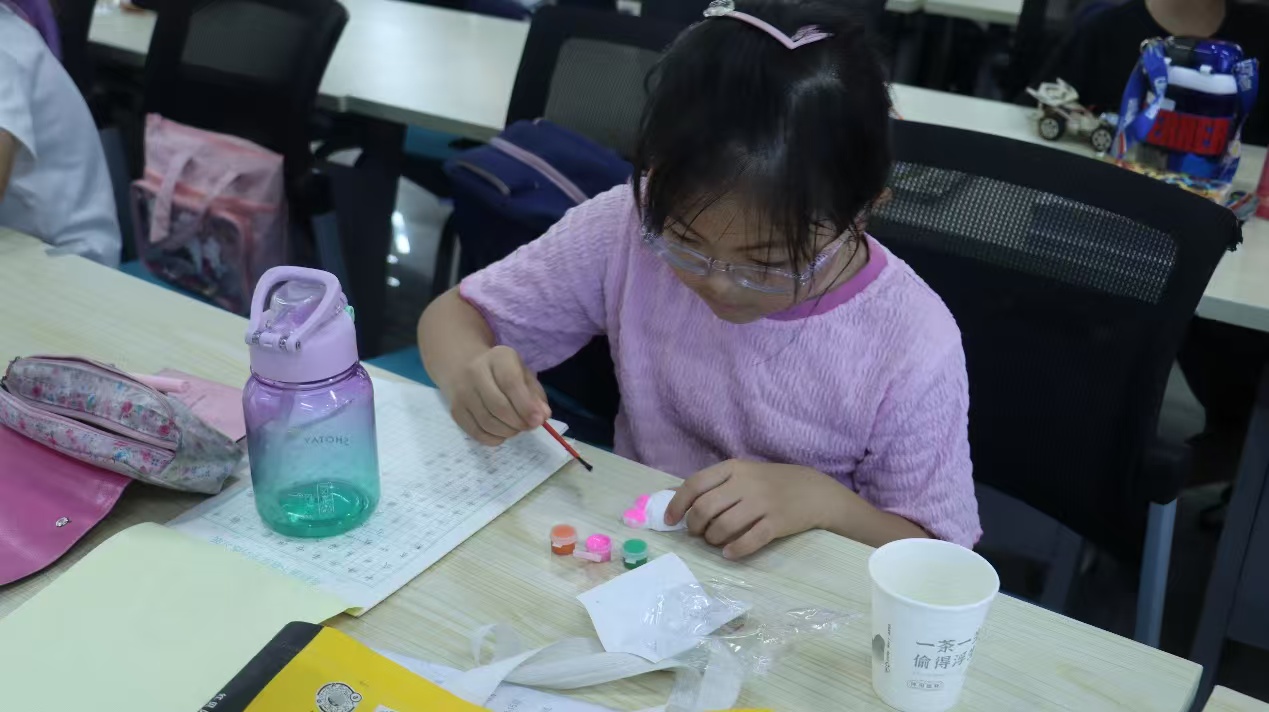 隨著實踐團成員們分發調色盤和丙烯顏料,閱覽室仿佛瞬間變成了一個微型藝術工坊。孩子們屏息凝神,小臉兒上寫滿了認真。他們仔細挑選著心儀的顏色,小心翼翼地在調色盤上調和出夢幻的粉紫、清新的薄荷綠、溫暖的鵝黃。畫筆輕輕觸碰石膏表面,發出細微而悅耳的沙沙聲,那是童心與藝術對話的密語。實踐團的成員們穿梭其間,時而蹲下身輕聲詢問創作思路,時而遞上洗筆的水杯,或用鼓勵的話語肯定孩子們大膽的配色:“這個紫色配金色太有想法了!”“你的漸變涂得真均勻!”他們的存在,如同溫暖而堅定的風,穩穩托起每一份稚嫩卻珍貴的藝術嘗試