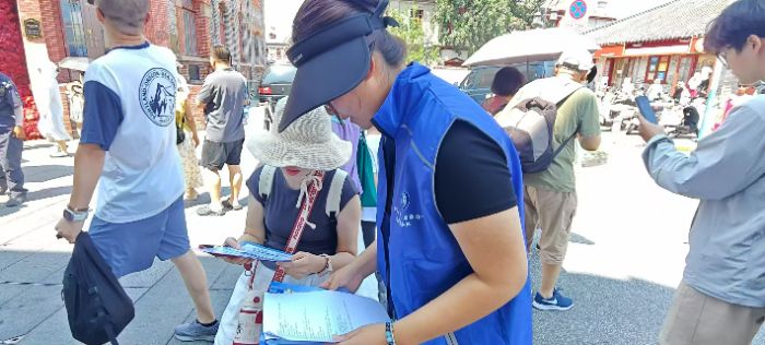 (圖為實踐隊成員在朝陽街為游客普及AI詐騙 “法盾防詐”實踐隊 徐瑛璐 供圖)