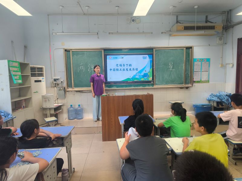 最后,實踐團成員向學生們普及了中國核工業發展歷程。從1964年中國成功爆炸第一顆原子彈,到近年來中國核工業轉向創新和可持續發展階段,對清潔能源和環境保護的要求增強展現了中國在核能技術領域的堅定決心和創新能力。