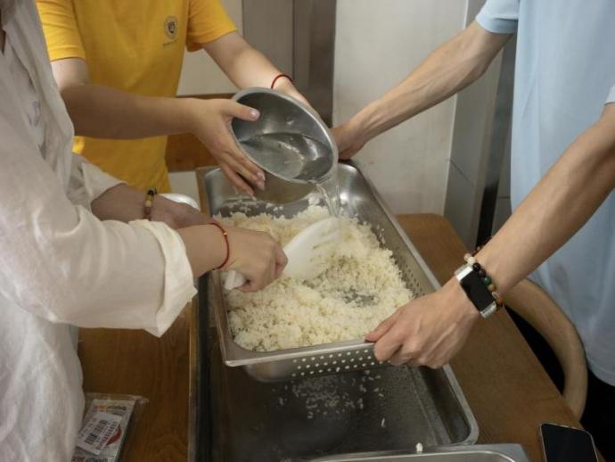 7月6日下午,微塵小隊于行云食堂“稻花香里釀新篇”。依循發酵原理,隊員示范選米、浸蒸、冷卻、拌曲、發酵全過程,嚴控拌曲溫度防滅活。酒曲米飯入盒壓實,中孔助發酵。夕陽西下,首批釀制的米酒散發出淡淡的醇香,這場融合傳統智慧與科學創新的實踐活動,不僅讓古老的米酒釀造技藝在校園煥發新生,更將健康生活的理念播撒于師生心田。