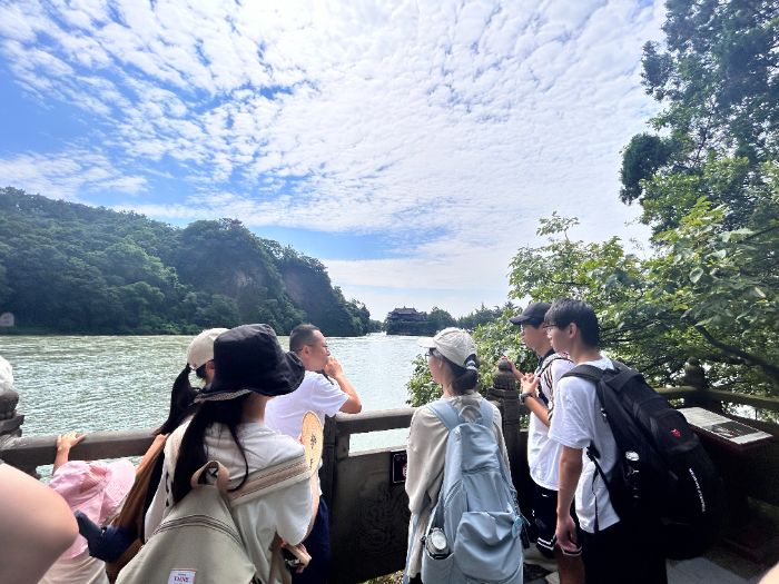 7 月 23 日,團隊前往世界現存最老的無壩引水工程:都江堰。都江堰水利發展中心工作人員帶著大家沿內江步道前行,在魚嘴分水堤旁講解 “四六分水” 原理 —— 豐水期內江分四成水、外江分六成,枯水期則反之,完美適應自然節律。飛沙堰前,工作人員指著堰體刻度說:“‘深淘灘、低作堰’六字訣,是古人留給我們的治水密碼。” 隨后實踐團成員前往二王廟,廟內 “遇彎截角,逢正抽心” 的碑刻與壁畫,生動詮釋了李冰父子 “因勢利導、疏而不堵” 的治水哲學。隊員們感嘆:這種與自然共生、順勢而為的智慧,正是現代水治理最需要傳承的精髓。”