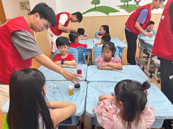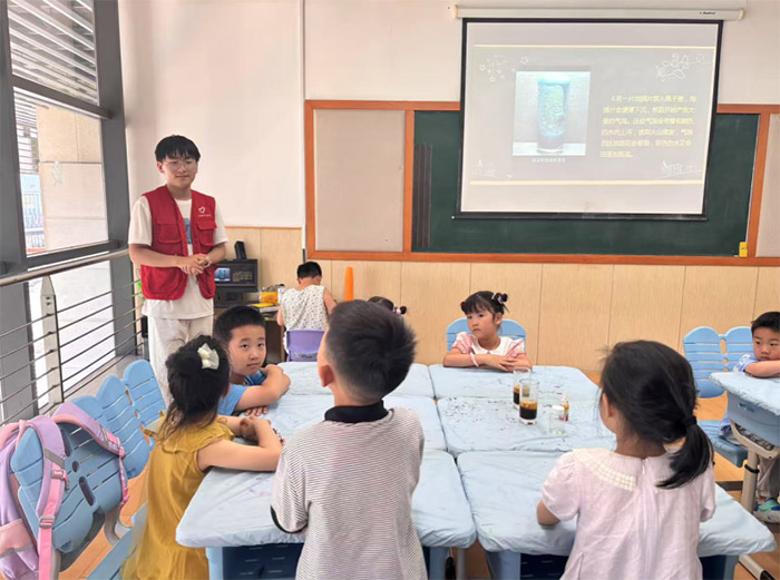 志愿者為孩子們揭開“火山噴發”現象的神秘面紗,此現象是由于泡騰片釋放二氧化碳,密度差讓“巖漿”上浮,氣泡破裂后又回落,模擬真實火山噴發。孩子們在這個過程不僅能感受到科學的樂趣,還可以學到科學知識。