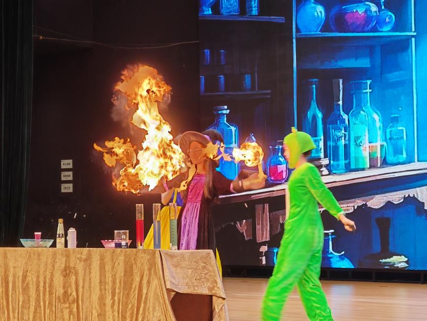 奇幻劇情串聯(lián)化學(xué)奧秘,趣味實(shí)驗(yàn)點(diǎn)亮科學(xué)思維 《綠色家園保衛(wèi)戰(zhàn)》以美麗的魔法森林為背景,講述了快樂(lè)的小青蛙、受傷的白雪公主在森林守護(hù)神的幫助下,聯(lián)合智慧的女巫,共同對(duì)抗污染惡魔、保衛(wèi)綠色家園的故事。劇中巧妙地融入了“橘子炸彈”、“清風(fēng)炮”等趣味設(shè)定,更特別設(shè)計(jì)了融合化學(xué)實(shí)驗(yàn)的“法老之蛇”“紫甘藍(lán)藥水”和“火焰掌”等環(huán)節(jié),將奇妙的化學(xué)現(xiàn)象轉(zhuǎn)化為直觀、有趣的舞臺(tái)呈現(xiàn)。當(dāng)實(shí)踐團(tuán)成員們用紫甘藍(lán)的“神奇藥水”演示不同溶液的顏色變化,用“火焰掌”模擬化學(xué)反應(yīng)驅(qū)散黑暗勢(shì)力時(shí),小朋友們目不轉(zhuǎn)睛,發(fā)出陣陣驚嘆,科學(xué)知識(shí)在生動(dòng)的劇情中悄然傳遞,讓“化學(xué)”不再是課本里的冰冷公式,而是守護(hù)家園的“超能力”。