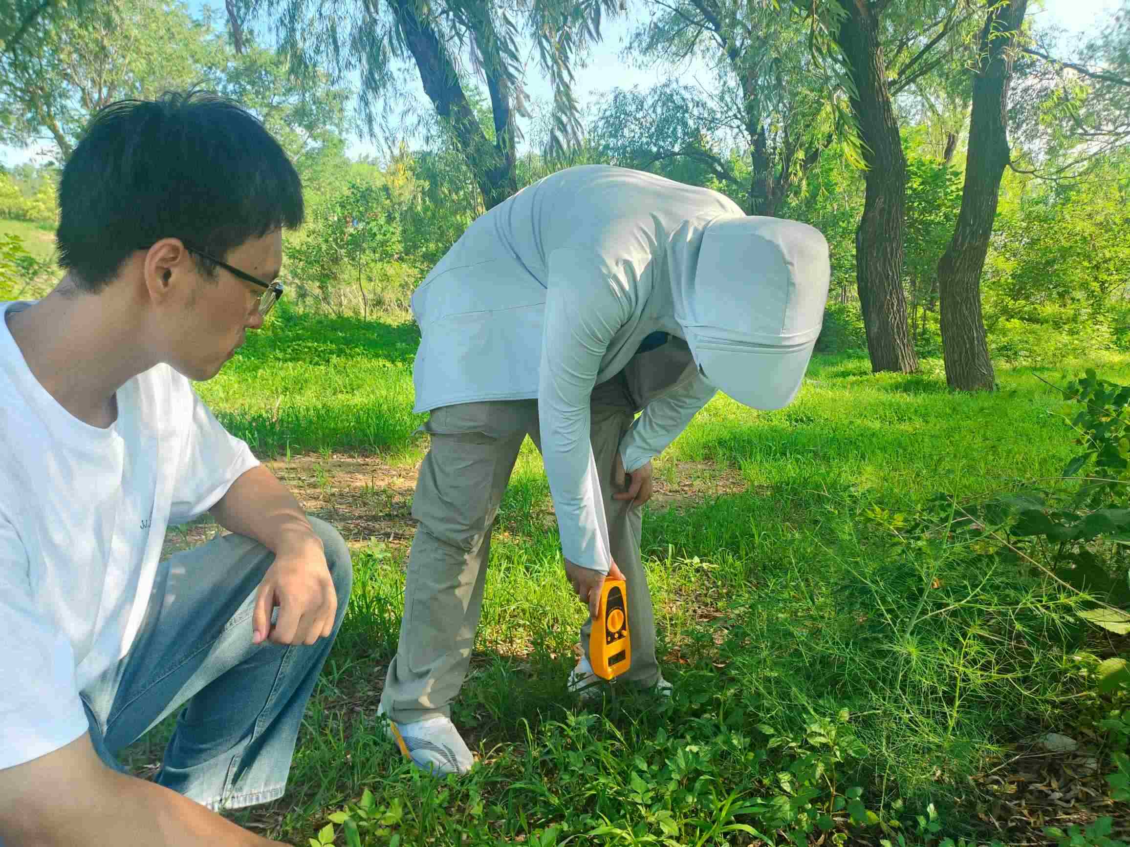 王磊老師現場示范植物樣方法調查技巧,指導同學們用樣方框劃定區域,細致記錄植物種類和數目。另一邊,取土樣小組手持采樣鏟、密封袋,按照“隨機多點采樣”原則,在不同植被覆蓋區采集0-20cm深度的土壤樣本,標簽上清晰標注采樣時間、經緯度與植被類型。濕度測定組則通過土壤濕度計,實時記錄不同地塊的土壤含水量,數據即時錄入調研表格。