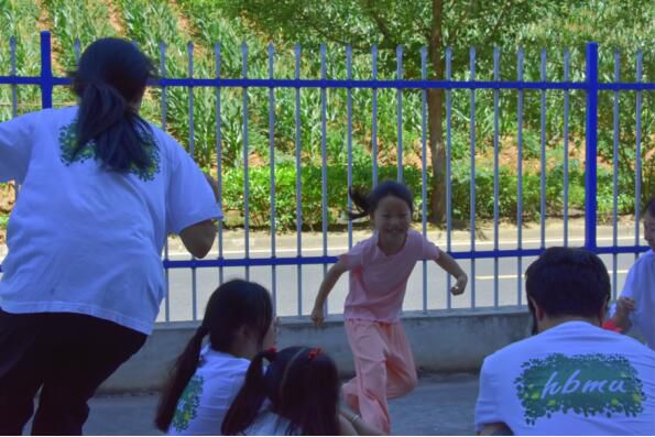 圖為實踐隊隊員與孩子們在做游戲。 卜1祥吉攝。