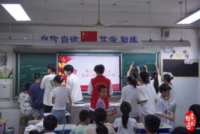 臨近結束,學生黨員、團員和少先隊員,紛紛在黑板上留言自己的愛國誓言:“吾輩自強,振興中華”、“為中華之崛起而讀書”、“茍利國家生死以,豈因禍福避趨之”……一行行真摯的留言,字里行間飽含著對歷史的深刻感悟、對和平的珍惜以及對未來的使命擔當。
