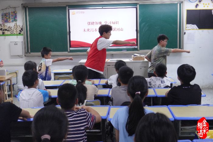 團隊的共青團員代表為師生帶來了精彩的軍體拳展示,并帶領在場的小學生們一同練習基礎軍體拳動作。在他的示范和口令下,同學們精神飽滿,口號響亮,認真投入地學習模仿,展現出昂揚的斗志,通過“示范+體驗”的方式,增強了青少年對國防實踐的認知和參與感。