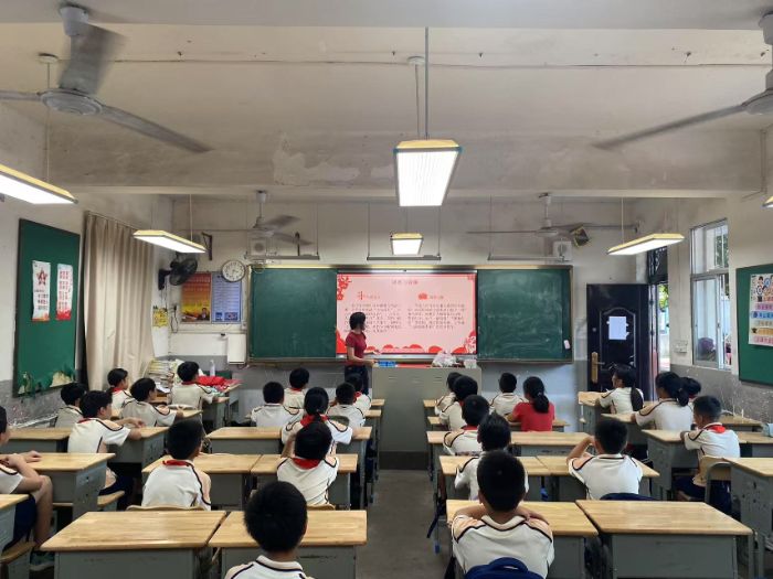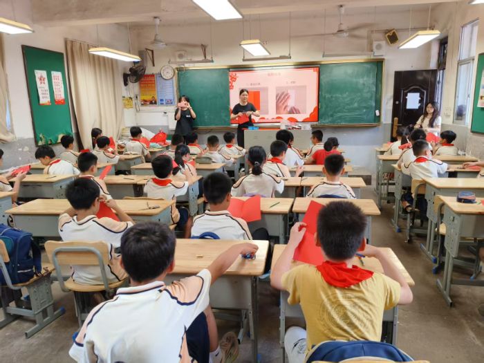 理論講解結束后,便進入了動手實踐環節。宣講團成員首先向孩子們展示了剪紙所需的工具——紅紙、刻刀、剪刀和鉛筆,并詳細講解了各自的用途。隨后,大家耐心地帶領孩子們一步步體驗剪紙的樂趣。從拿出紅紙、對折,到畫出竹節和尖尖的竹葉,再到剪掉多余部分,每一個步驟都細致指導。此外,成員們還教孩子們一種特別的剪紙方法:將正方形紙對折四次后,畫出7和5,加粗后只保留加粗部分,最后展開,一張別致的剪紙便呈現出來。