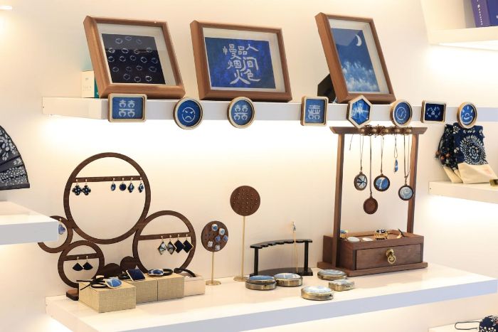 (圖為吳元新藍印花布藝術館內陳列的藍印花結合現代藝術周邊商品。孫涵攝)
