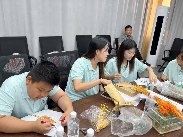在實踐活動的尾聲,體驗了富有創意的“麥粒創意拼貼”活動。隊員們親手從麥穗上取下顆粒,感受其飽滿的質地與自然的色澤。并且活動中特意選用了不同品種的麥粒,它們在形態和色澤上呈現出顯著差異,這天然形成的“調色盤”極大地豐富了我們的創作素材和表現力。通過精心排列與粘貼,平凡的麥粒在我們的指尖下逐漸化作生動的圖案。這不僅鍛煉了我們的動手能力和藝術審美,更讓我們在專注與耐心之中,深刻體會到“粒粒皆辛苦”的內涵,感受到每一顆糧食背后凝結的勞動價值,并認識到即使是尋常的農作物,也能通過創意煥發出新的生命力與美感,每粒麥子都藏著育種人的指紋,正如全國人大代表郭進考在實踐基地留言簿上所寫:“青年一代要把論文寫在大地上,讓中國飯碗裝滿優質中國糧。”
