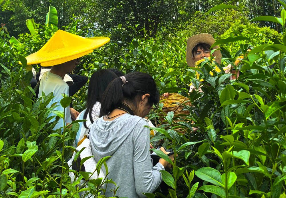 圖為7月15日,實踐團隊跟隨茶戶學習“一芽兩葉”采茶技藝。沈夢秋攝