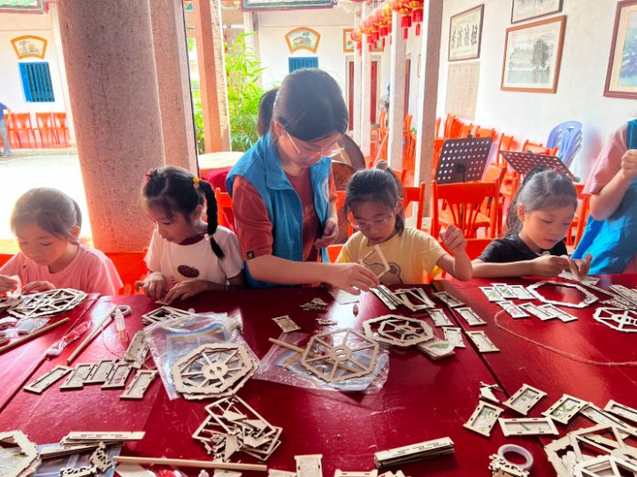 在廣東省潮州市,實踐團成員結合當地民俗開展“花燈溢彩”活動,指導小朋友制作潮州花燈,傳遞了潮州花燈這一非遺技藝,更讓小朋友們對家鄉文化的熱愛在心中扎根。