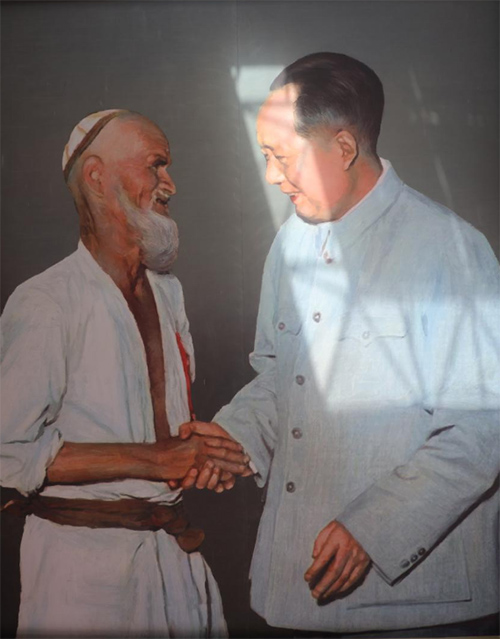 圖為庫爾班大叔與毛主席握手的照片