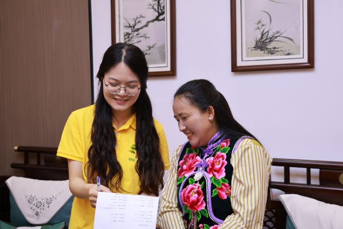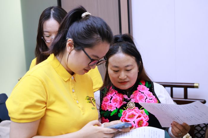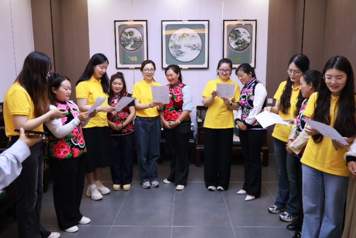 活動中最動人的環(huán)節(jié)是漢彝雙語詩歌朗誦,推普團隊與繡娘們通過《繡娘的歌謠》作品,讓普通話與彝語在藝術表達中碰撞出文化火花。通過逐句指導和反復練習,繡娘們的普通話發(fā)音得到顯著改善。同時,在繡娘的指導下,團隊成員們嘗試用彝語朗誦詩歌中的重要段落。推普團隊與繡娘們共同演繹《繡娘的歌謠》,在字正腔圓的普通話和悠揚的彝語交織中,展現(xiàn)了語言文化的交融之美。