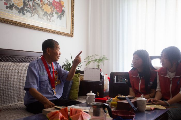 ▲圖為抗美援越老兵劉同文向實踐團成員展示老照片并講述戰場故事 劉慧鵬 攝