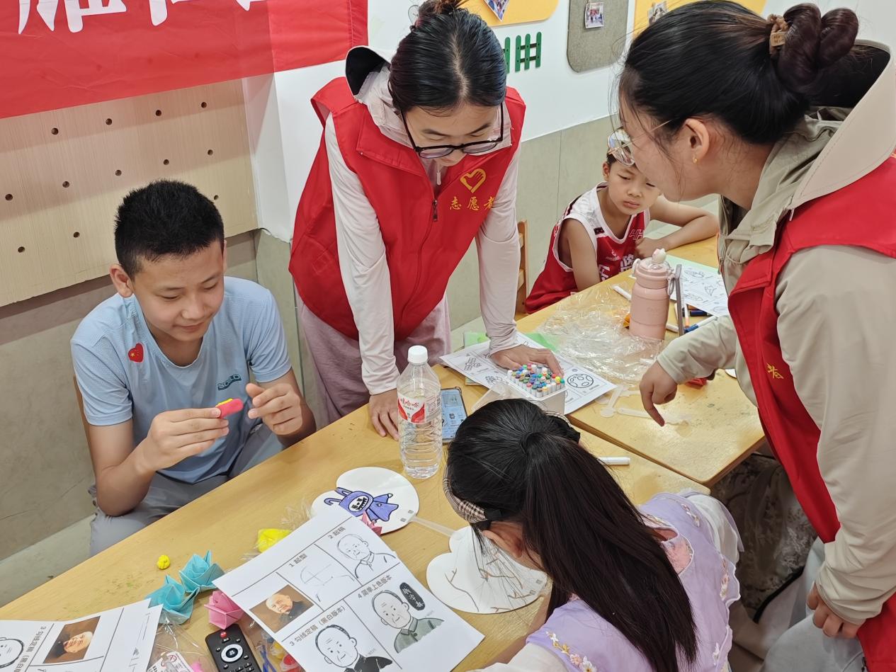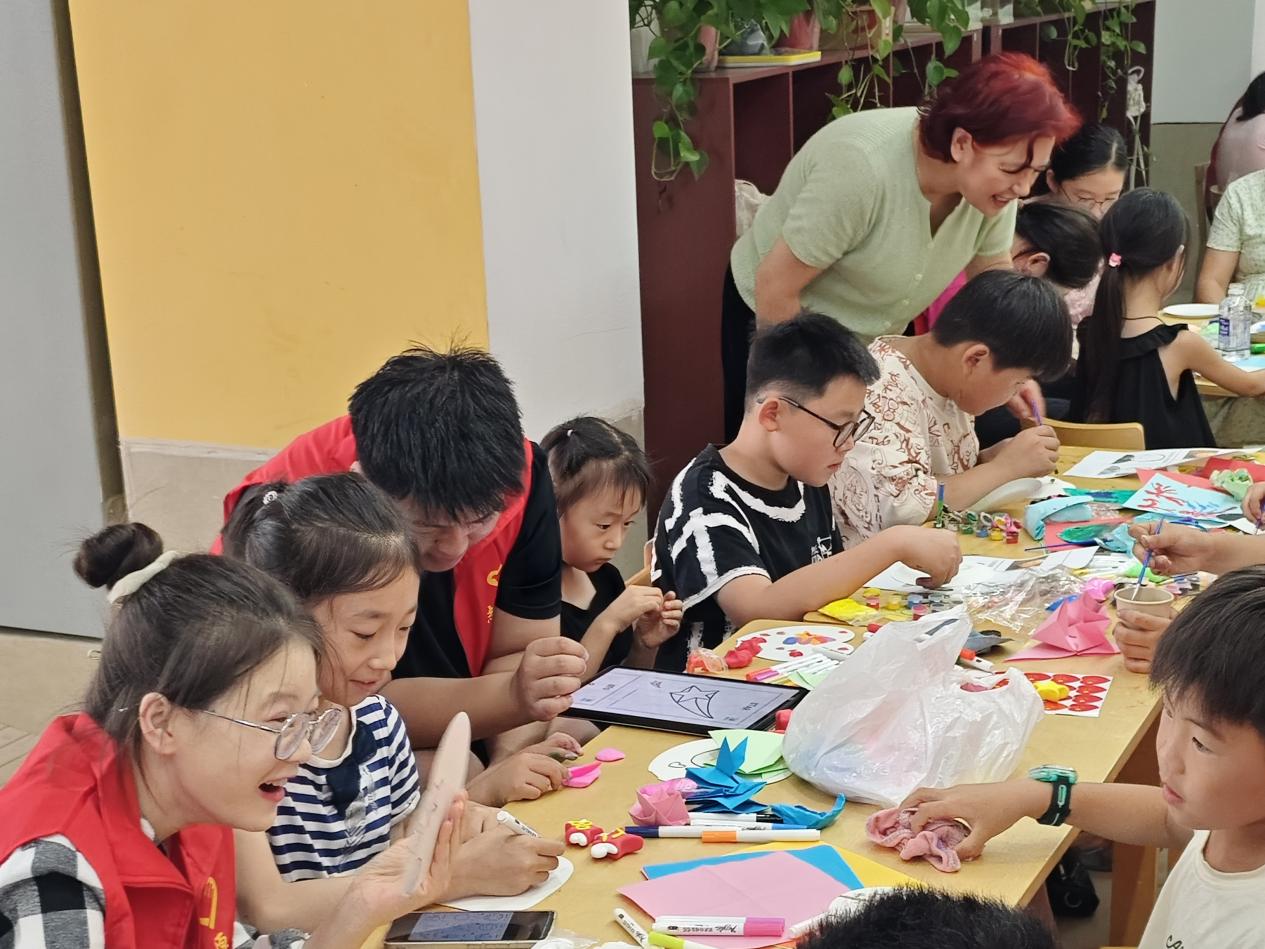 活動現(xiàn)場,社區(qū)便民服務中心的室內(nèi)洋溢著熱烈而歡快的氛圍。長桌之上,彩色卡紙、彩泥、剪刀、膠水、畫筆等手工材料擺放得滿滿當當,在燈光下閃爍著繽紛色彩,仿佛在召喚著孩子們?nèi)ラ_啟一場創(chuàng)意之旅。宣講團成員與社區(qū)的孩子們自由組合,分成若干小組,圍坐在一起,眼神中都透著期待與興奮。