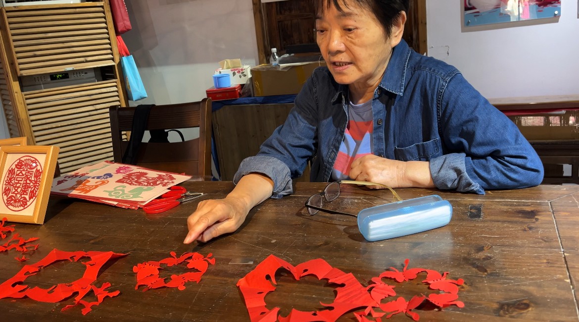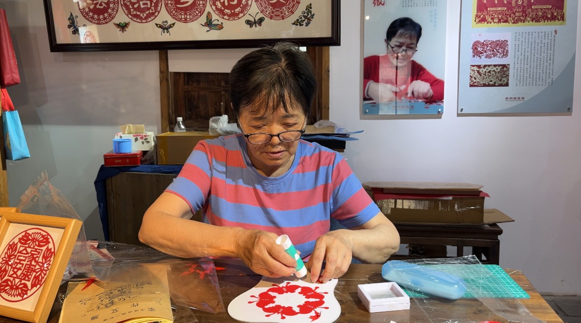 圖為任老師為剪好的作品進行裝飾、點綴。王瀚曼供圖