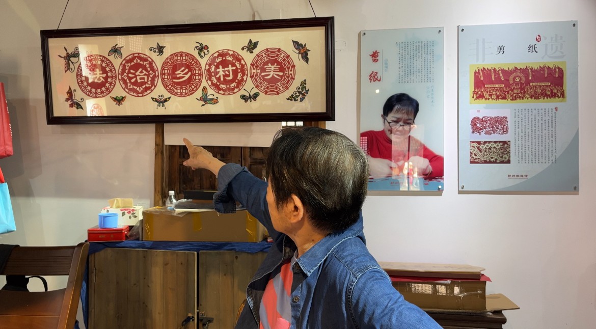 圖為任老師講解這些剪紙作品的圖案。王瀚曼供圖