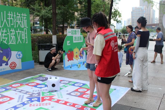 本次活動(dòng)一共四個(gè)環(huán)節(jié),用廢棄書(shū)本來(lái)?yè)Q取集印章卡片,通過(guò)垃圾飛行棋,墊排球,套蔬圈,知識(shí)問(wèn)答來(lái)集齊四枚印章即可換取蔬菜和多肉小盆栽。