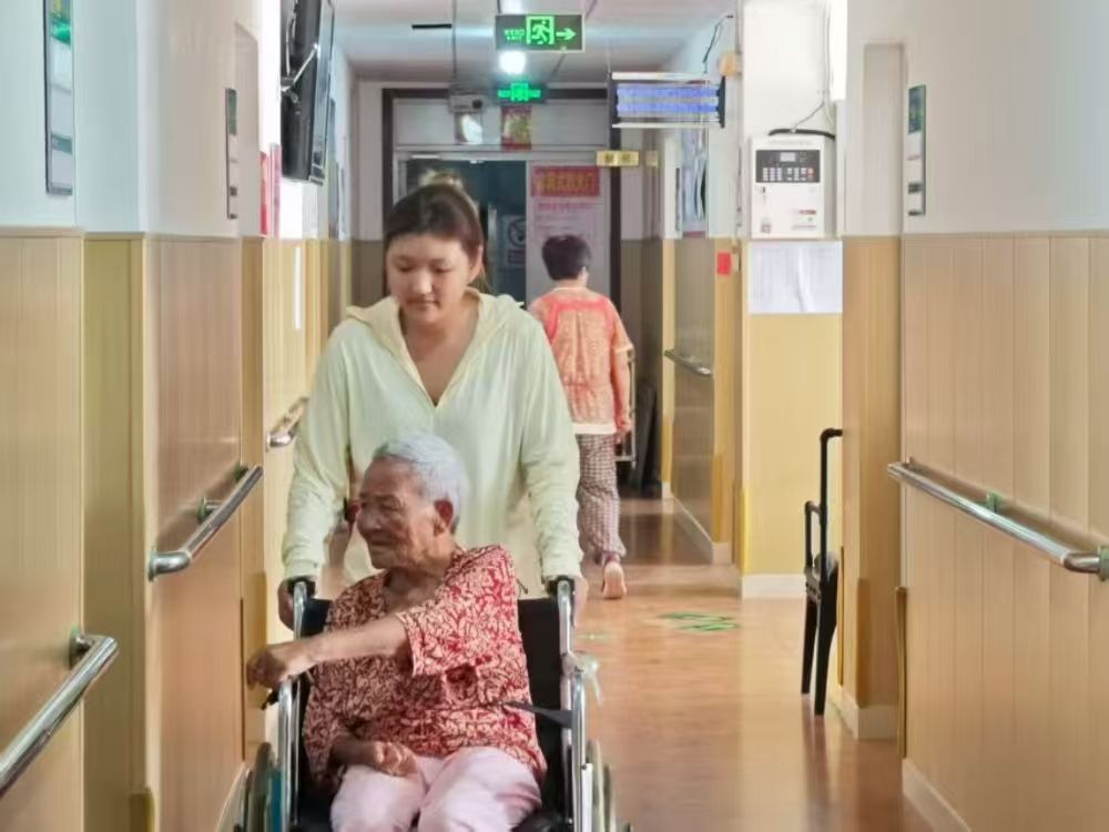圖為實(shí)踐團(tuán)成員王靜雯陪伴老人散步