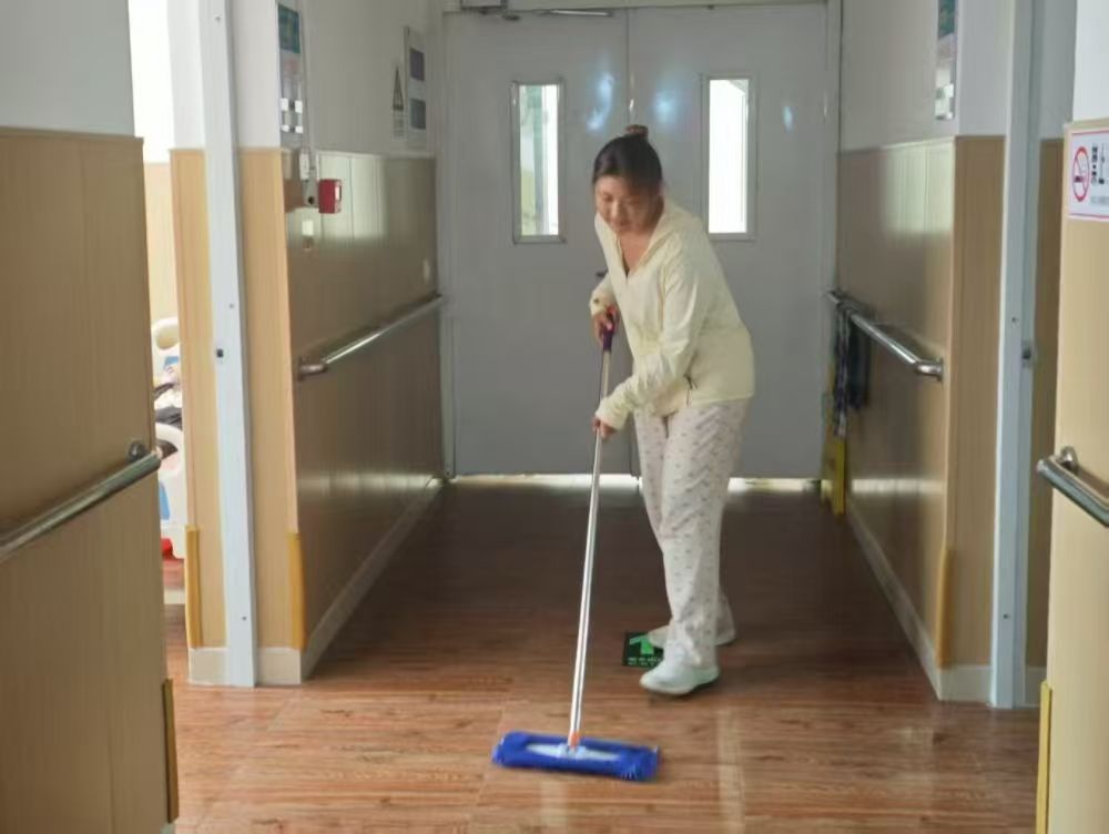 圖為實(shí)踐團(tuán)成員王靜雯正在清掃老年公寓走廊
