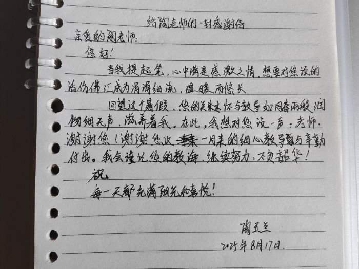 在本次實踐活動當中,陶艷同學(xué)不僅收獲了幫助他人的快樂,更感受到了來自鄉(xiāng)村小孩的感激之情。在實踐活動結(jié)束之際,鄉(xiāng)村小孩對陶艷同學(xué)的感激都匯在了這一封親筆所寫的感謝信當中。
