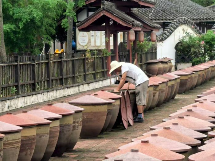 行至戰(zhàn)旗村戶外曬場,村民俯身照料陶罐的身影即刻映入眼簾。成排陶罐在陽光下沉默佇立,默默承載著豆瓣發(fā)酵的最后環(huán)節(jié)。隊員們注視著村民重復翻曬的動作,深切體悟到鄉(xiāng)村產(chǎn)業(yè)“慢堅守”的韌性——從作坊到曬場,每一個步驟都為了守住獨特風味、做響鄉(xiāng)村品牌。這質樸場景,讓青年們清晰明白“堅守+創(chuàng)新”是產(chǎn)業(yè)長青的密鑰,鄉(xiāng)村振興需要耐住性子、深耕細作。而曬場內,成排陶罐、古樸建筑與環(huán)繞綠植相互映襯,更將產(chǎn)業(yè)堅守的質樸展現(xiàn)得淋漓盡致。