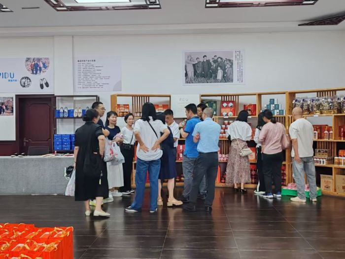踏入戰(zhàn)旗村產(chǎn)銷展廳,熱鬧氛圍便撲面而來。游客與導游圍繞貨架熱切交流,藍布鞋、豆瓣禮盒、特色酒品等各類特色產(chǎn)品陳列得整整齊齊。墻上的老照片,靜靜講述著戰(zhàn)旗村產(chǎn)業(yè)變遷的故事。隊員們仔細觀察著這里“展示+銷售+文化傳播”的模式,探尋從線下體驗到線上帶貨的銜接路徑,從中洞察到“三產(chǎn)融合”激活鄉(xiāng)村經(jīng)濟的關鍵所在,也深刻明白,產(chǎn)業(yè)協(xié)同能夠讓傳統(tǒng)產(chǎn)業(yè)煥發(fā)新生機。展廳內,游客與導游的互動,貨架上滿滿當當?shù)奶厣a(chǎn)品,以及墻上老照片與現(xiàn)代陳列的交融,都生動呈現(xiàn)出產(chǎn)業(yè)融合的蓬勃活力