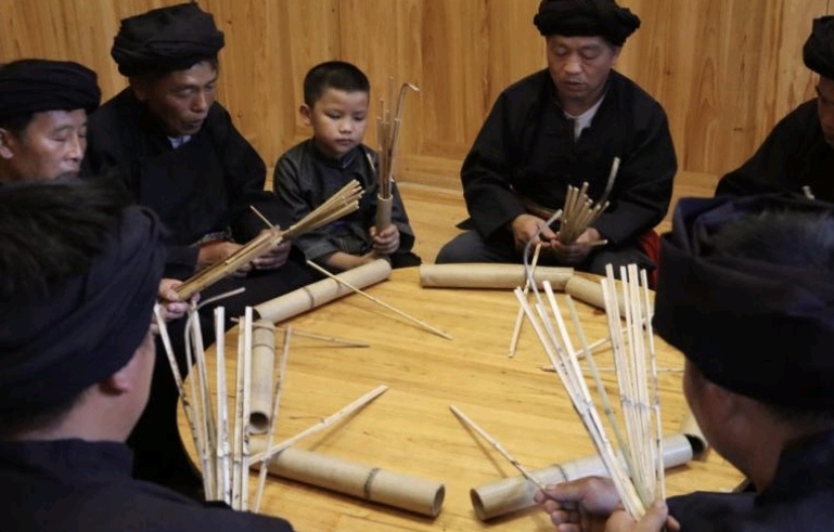 走進(jìn)國家級非遺傳承人李會(huì)堂老師的木樓,團(tuán)隊(duì)見證了一場原汁原味的賈理教習(xí)儀式。七位賈師身著苗族傳統(tǒng)服飾,圍坐成圈,手持竹片與竹筒,伴隨低沉悠揚(yáng)的苗語吟唱,竹片叩擊發(fā)出清脆“篤篤”聲。團(tuán)隊(duì)成員分工協(xié)作,有的拍攝記錄流程,有的采訪賈師與幼童,還有的整理頌詞結(jié)構(gòu)和文化內(nèi)涵。實(shí)踐團(tuán)了解到,賈理不僅是一部口耳相傳的“文化法典”,更是苗族最古老的教育形式,通過聲音與節(jié)奏,將文化智慧代代傳承。