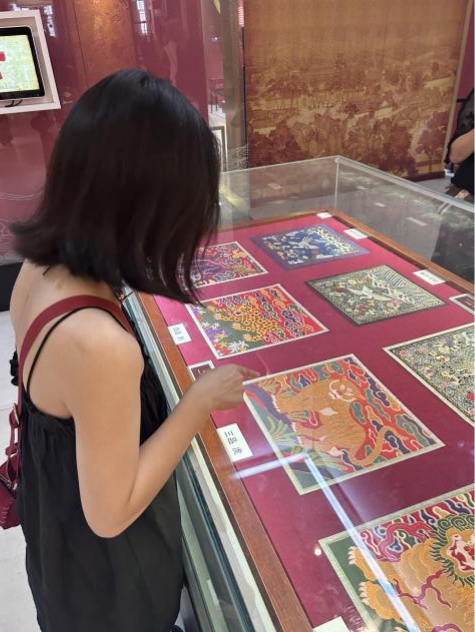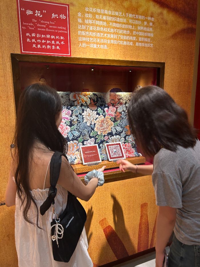 當成員們湊近欣賞時,驚喜地發(fā)現(xiàn)每一幅作品覽柜下的小小二維碼。手機快掃,15秒語音立刻把“通經(jīng)斷緯”講得通俗易懂;高清圖可放大20倍,金絲走向一覽無余;再掃一下直跳官方微店,同款紋樣文創(chuàng)一鍵下單。不用租講解器,不用排隊等講解員,手機就是隨身導游。老工藝配上新科技,逛展體驗瞬間從“看不懂”變成“停不下來”。