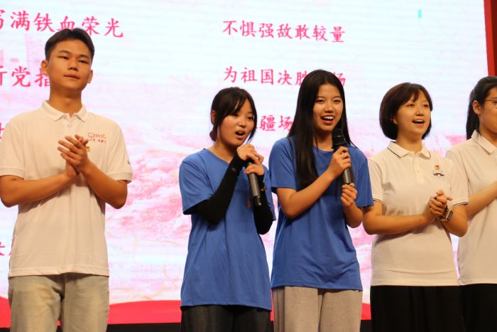 安理工實(shí)踐團(tuán)隊(duì)隊(duì)員(左二、左三)演唱紅歌《強(qiáng)軍戰(zhàn)歌》。王智杰 攝