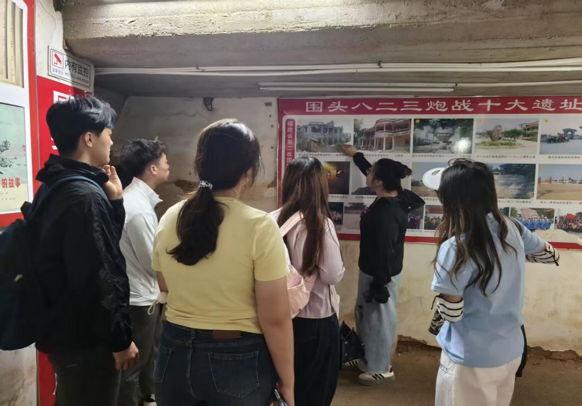 在圍頭村第一黨支部書記洪萬亞接待下,實踐隊踏入圍頭八二三戰地公園,團隊首先參觀了炮戰紀實展館,在“炮擊金門”主題展區,隊員們駐足于詳實的文字史料、珍貴的歷史照片前,深入了解 1958 年“八二三炮戰”這一重要歷史事件。從戰役背景到具體進程,從炮火交鋒到兩岸關系的微妙轉折,大家沉浸式回溯那段充滿熱血與堅守的歲月,深刻認識到維護國家領土完整、捍衛民族尊嚴的重大意義,體悟到先輩們在復雜局勢下堅定守護家國的決心。