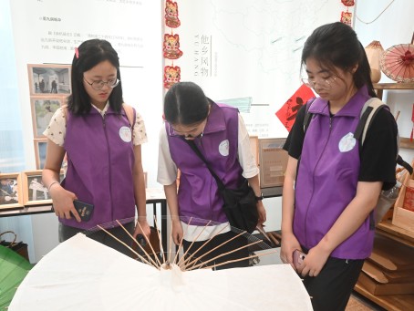 “欲知大道,必先為史。”隊員們在老師的引領下步入中國傘博物館,仔細觀摩館內珍藏的歷代珍品,通過實物了解其形制、工藝和紋樣的演變。老師深邃的眼睛看著一張鮮紅的傘面,道出了這柄長征傘的故事。現代傘雖不再需要七十多道復雜的工藝,但這門非遺技藝本身早已超越了傘的實用性,是華夏歷代先輩的智慧結晶。隊員們特別希望將這項技藝帶回日常,讓這份雅致風韻在新時代綻放獨特色彩。