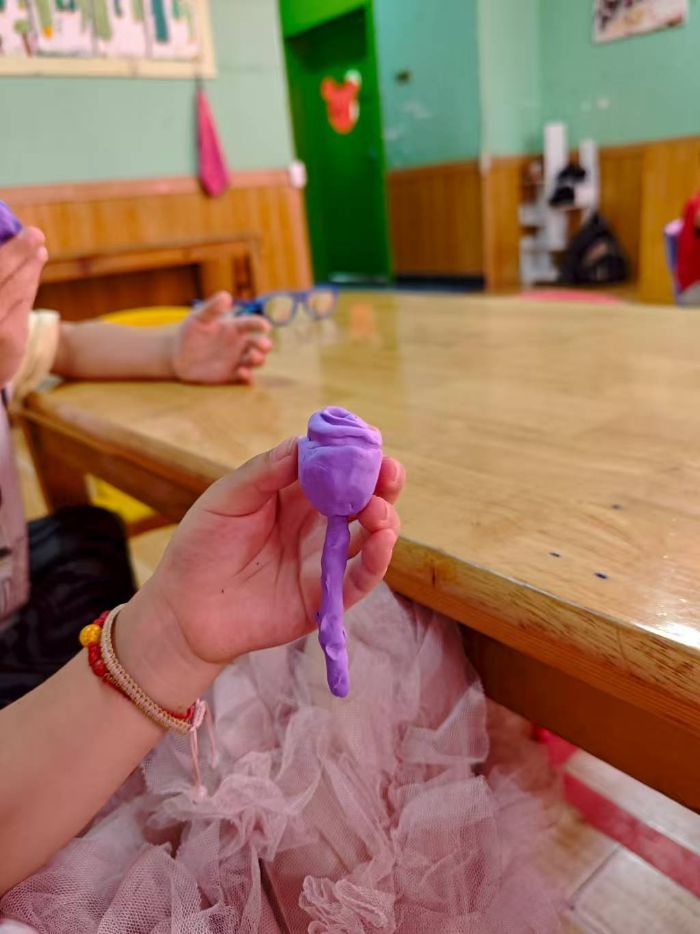 在童欣幼兒園暑期托管現場,志愿服務隊依托學前教育專業優勢,構建“創意+協作+實踐”課程矩陣。手工創作課上,志愿者以超輕黏土為基礎材料,系統講解“黏土塑形—紙巾包裹—創意裝飾”全流程。孩子們化身“小小工藝師”,從揉、搓、捏基礎動作起步,將黏土塑造成糖果芯,再以紙巾精細纏繞“糖身”。超輕黏土化身“魔法泥”,孩子們將想象力傾注指尖,一朵紫玫瑰在小手托舉中綻放,紋理里藏著未說盡的童話,部分孩子突破常規,在紙巾表面添繪多彩圖案,讓“糖果”自帶專屬故事。創作過程中,顏色搭配討論聲、造型調整互助聲交織,一個個“多彩糖果”有序粘貼至圓形卡紙展板,逐步構建出童趣滿溢的創意圖景。