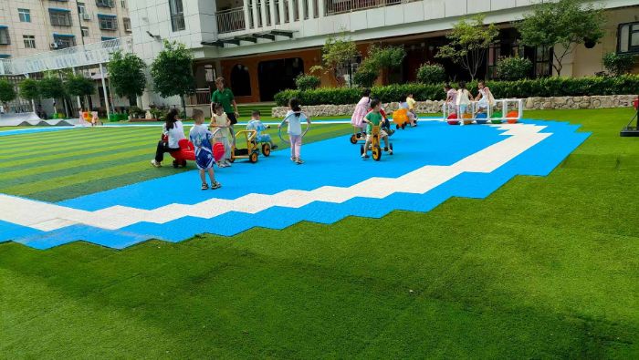 戶外實踐課把操場變為活力舞臺。藍色拼接地墊區域內,騎小車競速、呼啦圈接力等團隊游戲依次開展。志愿者以“安全協作”為原則,引導孩子明確分工、相互配合。從“單人挑戰”到“團隊協作”,孩子們在奔跑、傳遞中提升肢體協調性,在溝通鼓勵中強化集體意識。戶外天地里,團隊游戲打破陌生邊界,你幫我扶上車、我給你遞圈,把“獨自玩”升級成“一起嗨”,每一次交流、每一回協作,都在給“社交力”“創造力”蓄能,歡笑聲與蟬鳴聲交融,勾勒出夏日最具活力的成長剪影。