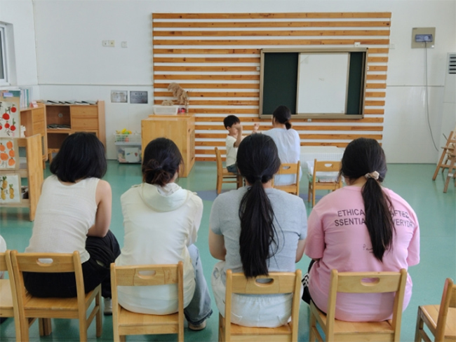 本次活動以深化對融合教育相關理念與實操的理解為主旨,分為特教班實踐和隨班實踐兩個部分;顒忧捌,成員們進行活動調研,與教師展開交流,了解特教班的概況。活動中期,成員們觀摩一節節的特教班課程,與特殊幼兒互動接觸,與教師交流探討,成員們積極提問與記錄,深入了解沙家浜幼兒園的融合教育情況。