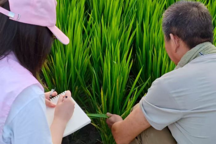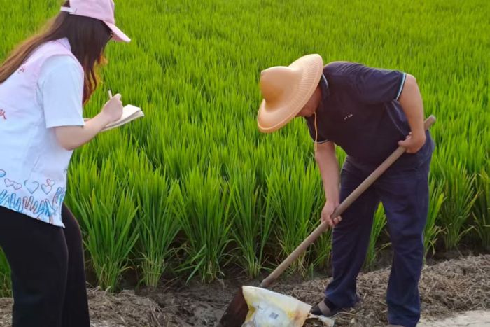 在田間實踐環節,志愿隊與基地農民水稻栽種員展開深入交流。多位擁有十年以上種植經驗的“老把式”結合親身經歷,講述基地推行標準化管理后,水稻種植在抗病能力提升、產量增長等方面的顯著變化,直觀展現科技指導對農業生產的推動作用。隨后,隊員在農技人員的指導下挽起褲腳、踏入田間,親手參與除草、補苗等農事操作,在彎腰勞作中感受“汗滴禾下土”的艱辛,也深刻理解糧食生產對各民族群眾生活保障的重要性,進一步強化對不同地區勞動者的共情,讓民族團結的認知從理論走向實踐。