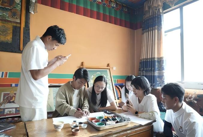 墨竹工卡縣是國家鄉村全面振興工作聯系點,實踐團追尋墨竹工卡縣紅色印記,參觀赤康村黨建基地,深入了解鄉村振興發展歷程,感受紅色文化底蘊;走訪格桑花開產業園、凈土產業園,調研現代產業與民族傳統融合創新模式,通過實地參觀、生產體驗等多種形式,全面了解縣域產業結構、發展模式及創新舉措,感受鄉村振興豐碩成果。隊員們結合數字經濟專業知識,為當地產業數字化轉型升級、電商渠道拓展和特色品牌打造提供新思路和建議。實踐團還前往墨竹工卡縣扎雪鄉龍珠港村,拜訪青年唐卡畫師尼瑪次仁,沉浸式開展唐卡非遺研學。隊員們發揮專業特長,為唐卡錄制普通話推介視頻,以新傳媒技術助力藏地非遺文化傳播,傳承文化瑰寶。