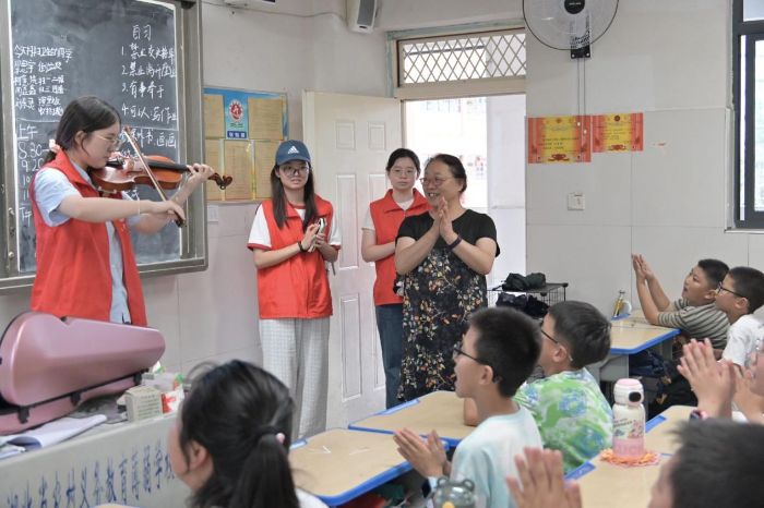 圖為志愿者在音樂課上為孩子們拉小提琴,并介紹小提琴,拓寬了孩子們的音樂素養。多彩大學生網通訊員黃夢婷攝
