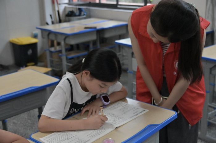圖為志愿者為孩子們輔導作業。多彩大學生網通訊員黃夢婷攝