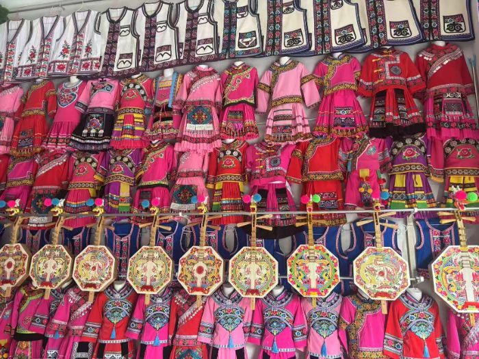 實踐期間,隊員以彝人古鎮店鋪工作人員、刺繡傳承人為主要采訪對象,圍繞彝族服飾的核心要素展開調研。在色彩體系方面,經實地觀察與受訪者介紹確認,彝族服飾以黑、紅、黃為基礎色調,其中黑色象征對土地的敬畏,紅色代表生活熱情,黃色寓意豐收希望。調研中發現,當地服飾常以黑色為底色,搭配大紅色火焰紋與金黃色太陽圖案,形成具有強烈視覺辨識度的色彩組合。