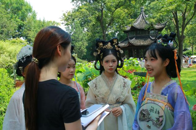 圖為實(shí)踐團(tuán)隊(duì)成員陳思源采訪(fǎng)來(lái)自江西的漢服小女孩們。蘇家豪 供圖。