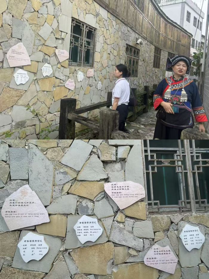 下午的實(shí)踐行程從“布依語言文明墻”研學(xué)開啟。在旅游使館解說員的帶領(lǐng)下,學(xué)子們逐一觀察墻面鑲嵌的20余塊刻字碎石,上面用“漢布依對(duì)照”方式標(biāo)注了“家人”“學(xué)校”“感謝”等日常用語,如“老師”對(duì)應(yīng)布依語“sangs”、“朋友”對(duì)應(yīng)“biangx youq”。解說員結(jié)合發(fā)音口型演示布依語聲調(diào)規(guī)律,以布依族經(jīng)典民歌《好花紅》的“五句式”韻律為案例,對(duì)比分析其與漢語詩(shī)歌的節(jié)奏差異,闡釋“借歌傳情、以語達(dá)意”的布依文化表達(dá)特色。將語言學(xué)習(xí)與民族傳承歌曲相結(jié)合,增強(qiáng)學(xué)子的語言文化認(rèn)同感。
